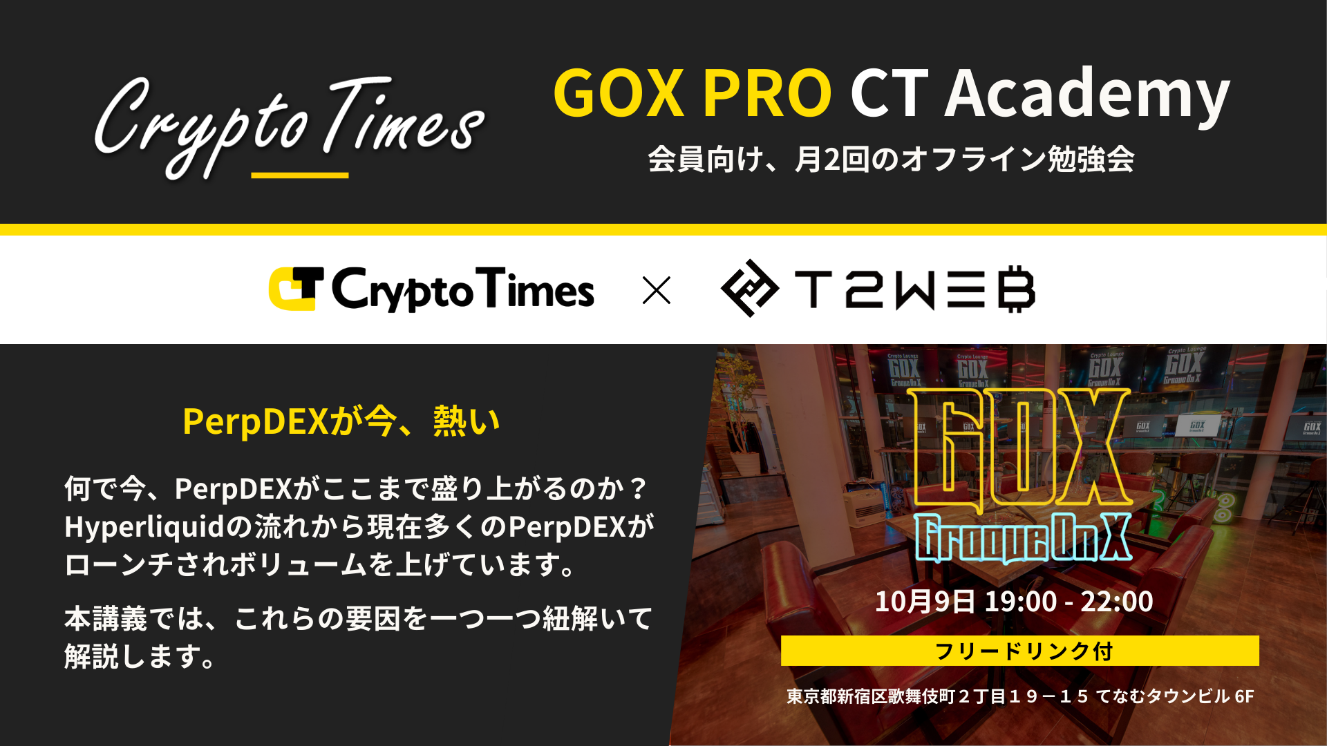 CryptoLoungeGOXは、クリプトに関する情報交換やコミュニケーションを目的としたラウンジスペースです。